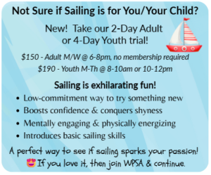 We’d love to have the community self subscribe to our email list to be alerted to WPSA events and communications. Don’t miss when Membership, Dry Sail, and Sailing Lesson Enrollments open!! Contact us to ask any WPSA questions or self-subscribe HERE to join our email list right now.