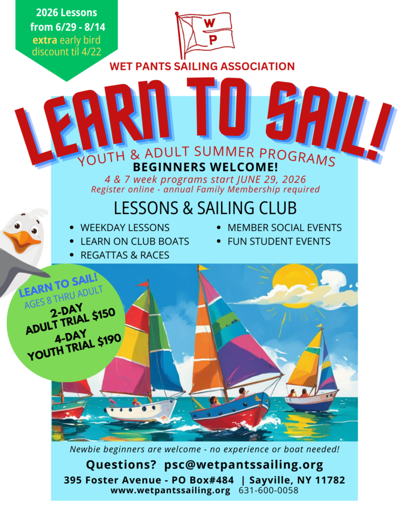 WET PANTS SAILING ASSOCIATION Sailing Club & Sailing School – Founded in 1934 – 395 Foster Ave – PO Box 484 – Sayville, NY – 40° 43′ 26.5″ N 73°04′ 26.0″ W